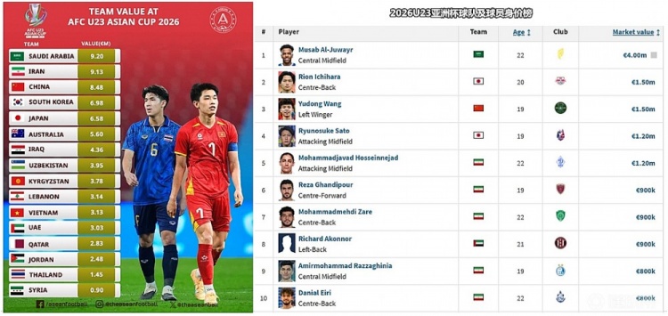 本届U23亚洲杯,U23国足全队总身价达到了848万欧元,仅次于沙特(920万欧元)和伊朗(913万欧元),位列16支球队的第三位,日本U23球员身价总和只有658万欧元,仅排在第五位。在球员身价排行榜上,王钰栋与日本球员市原吏音(150万欧元)并列第二,仅次于沙特天才少年朱维尔(400万欧元)。考虑到李昊如今的身价已经飞涨至185万欧元,U23国足的星味超过了决赛对手。